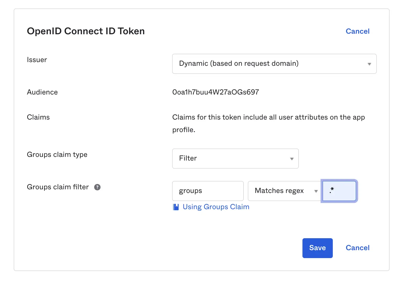- Click to edit the Open ID Connect Token. Modify the selector to Matches Regex and then use