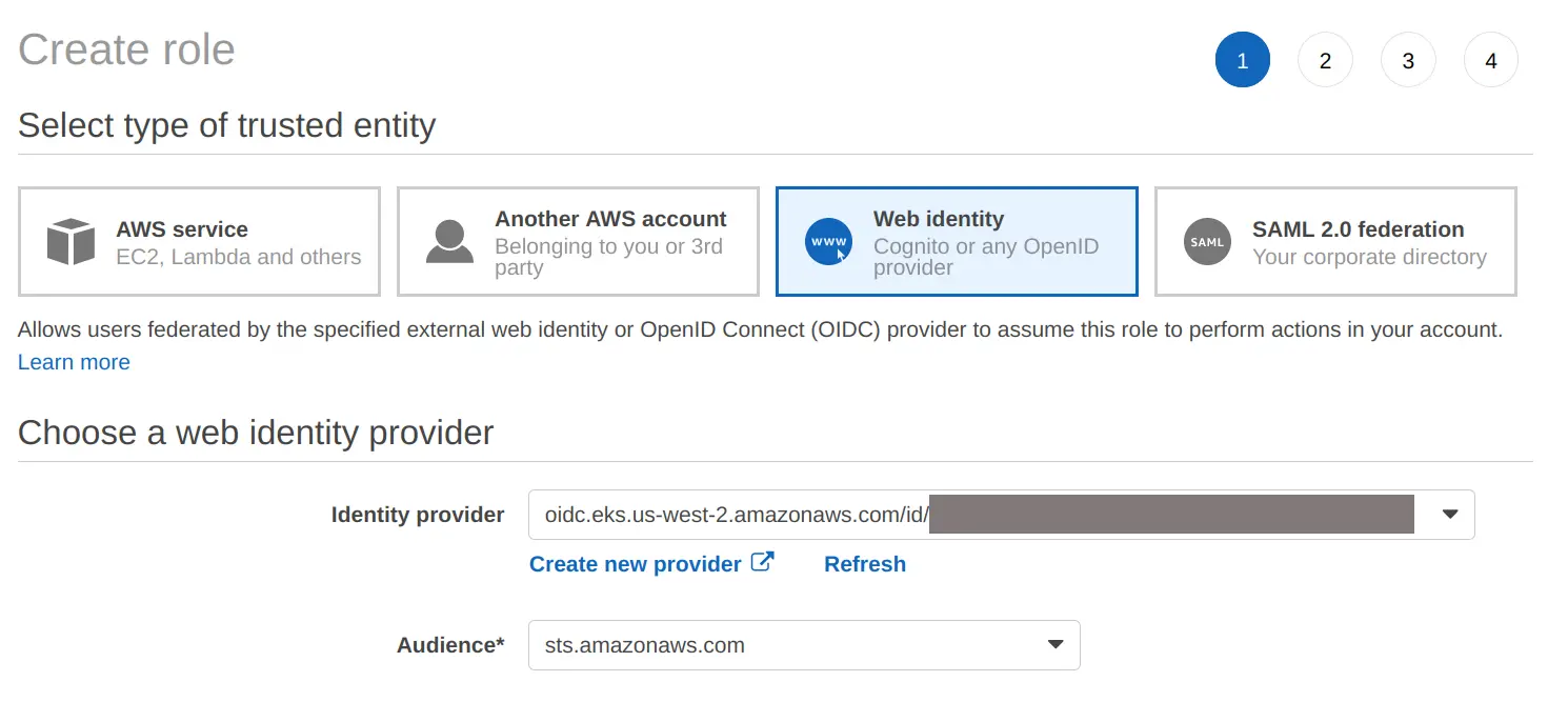 Next, select “Web Identity”, and choose the OIDC provider for your EKS cluster. Choose sts.amazonaws.com